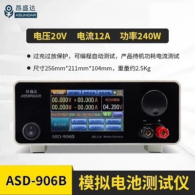 240W(ASD906B):搭载4.3寸触摸显示屏,支持5挡电压自动测试与电压点保护测试,电压分辨率达1mV、电流分辨率达1μA,可精准检测产品过充、过放保护性能,适配快充产品调试。