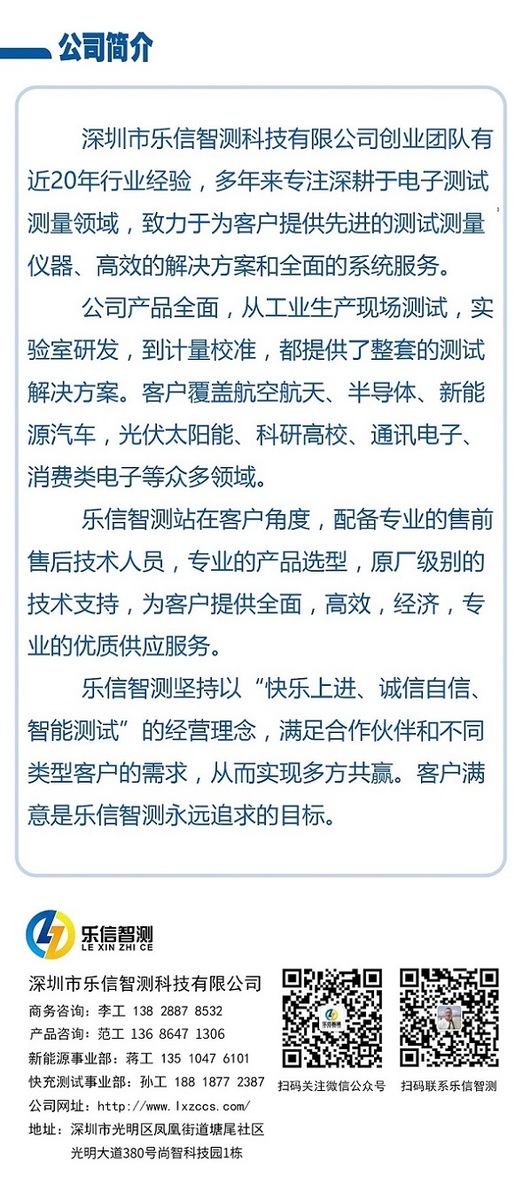 深圳市乐信智测科技有限公司拥有近20年电子测试领域经验,专注为客户提供先进的测试仪器与一站式解决方案。我们配备专业售前售后技术团队,提供精准产品选型、原厂级技术支持、完善售后保障三大核心服务,切实站在客户角度,为航空航天、通讯电子、消费类电子等多领域客户,提供高效、经济、专业的供应服务,助力企业降本增效。